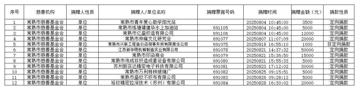 常熟市慈善基金会关于2025年8月接受捐款情况的公示