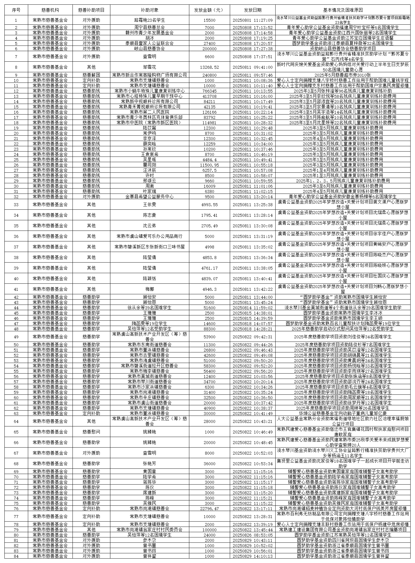 常熟市慈善基金会关于2025年8月资金使用明细的公示