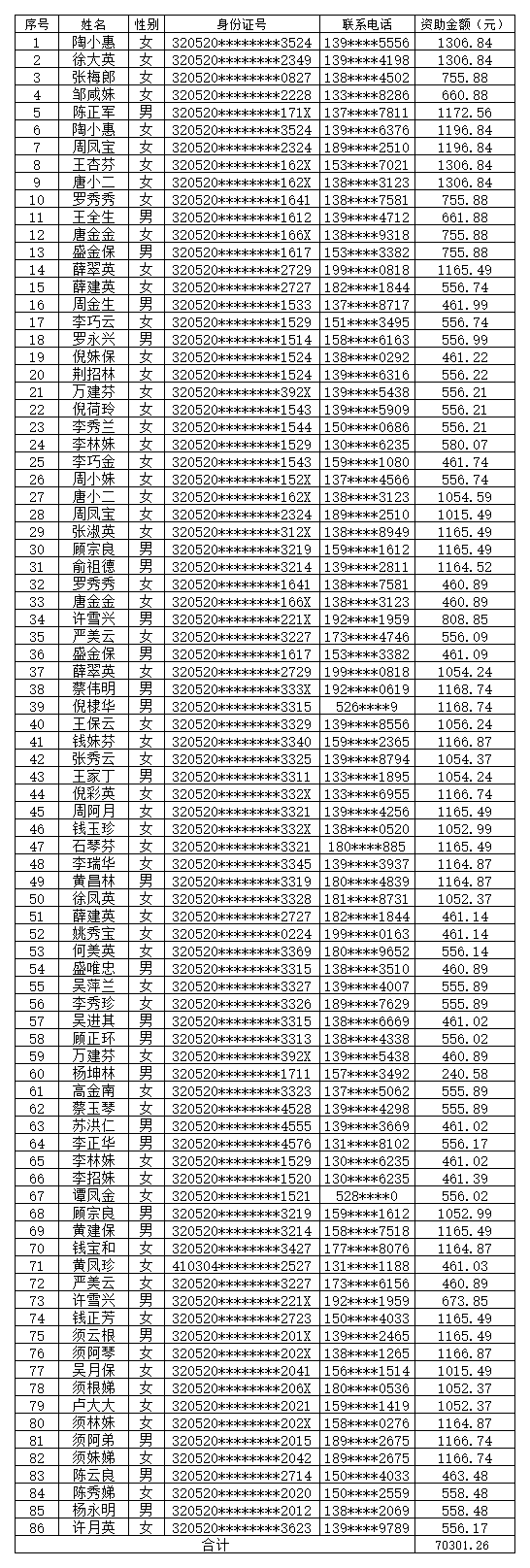 常熟市慈善总会与江苏省老龄事业发展基金会协作开展“资助白内障患者公益项目”,对符合条件的白内障患者手术治疗费用自付部分给予全额资助。2025年9月共资助86人,资助金额70301.26元。现将资助明细予以公示,接受社会监督,公示期为7个自然日(2025年10月17日至10月23日)。在公示期间若对公示名单有异议,可向常熟市慈善总会综合部反映,电话:0512-52028068。